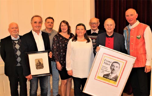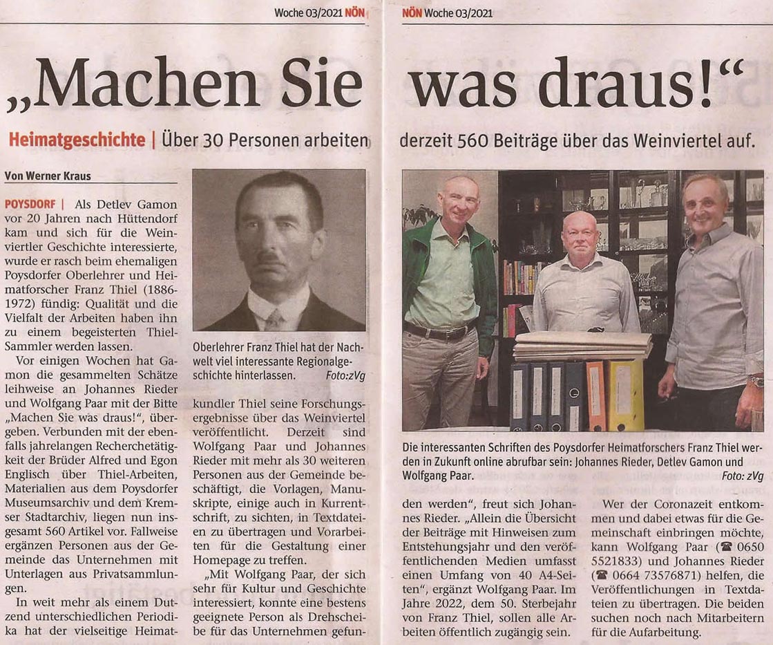 Franz Thiel (1886 – 1972) hat sich neben seinem Beruf als Volksschullehrer seit jungen Jahren für die Heimatforschung interessiert. Im Laufe seines Lebens hat er die unterschiedlichsten Chroniken durchforscht und seine Erkenntnisse in vielen hundert Artikeln zusammengefasst und veröffentlicht. Aus dem Weinviertel bzw. der allgemeinen Geschichte unserer Region konnten mehr als 600 Arbeiten gefunden werden, aus seiner ursprünglichen Heimat Nordmähren (Mährisch Schönberg, heute Šumperk) sind knapp 200 Arbeiten bekannt.